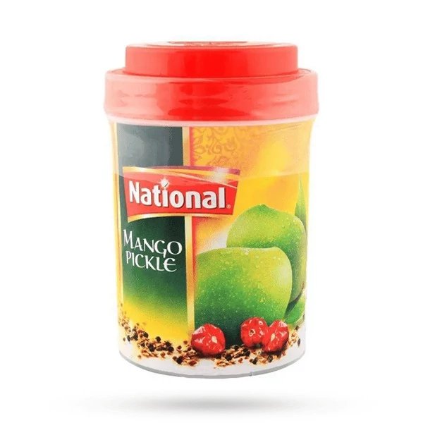 ترشی انبه برند national بسته بندی یک کیلوگرمی تولید کشور پاکستان مواد تشکیل دهنده: انبه (70٪ )، روغن سبزیجات ، میکس ادویه جات ، نمک ، فلفل قرمز ، دانه های پیاز و زرد چوبه