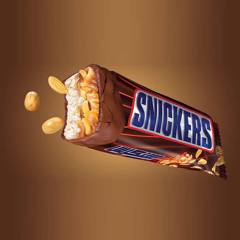 شکللت اسنیکرز شامل نوقا با کارامل و بادام زمینی است و از لایهای مرکب از شکلات و شیر پوشیده شده است.